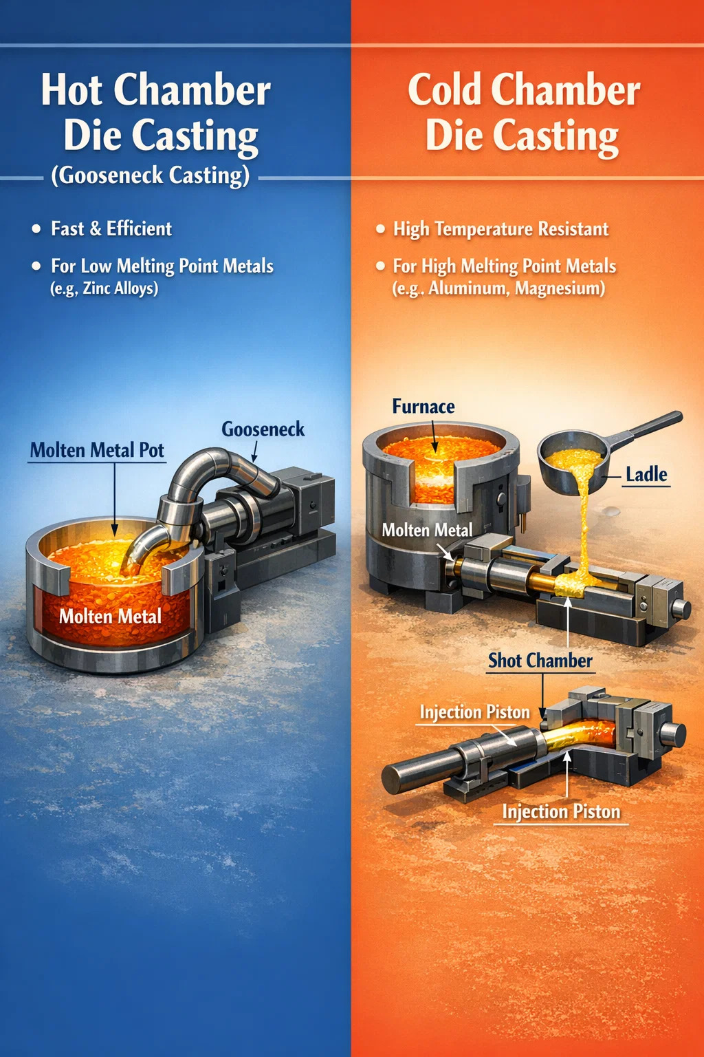 বিশ্বের মধ্যে ডাই ঢালাই , কিভাবে ধাতু গলিত এবং ছাঁচ মধ্যে ইনজেকশনের উপর ভিত্তি করে দুটি প্রধান বিভাগ আছে: হট চেম্বার ডাই কাস্টিং এবং কোল্ড চেম্বার ডাই কাস্টিং।