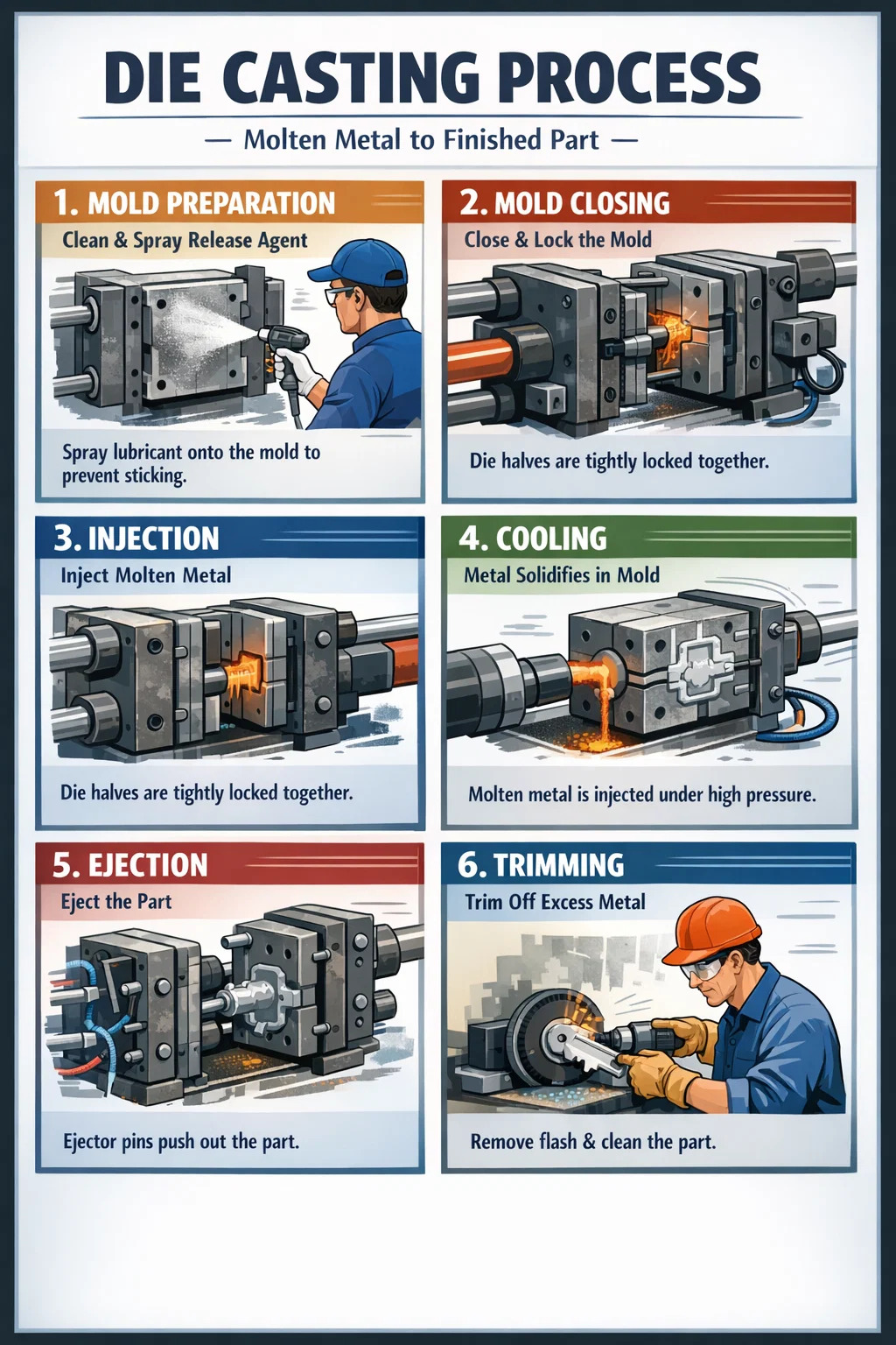 মূল পয়েন্ট: এই মুহুর্তে, মেশিনটি ছাঁচটি লক করার জন্য প্রচুর শক্তি প্রয়োগ করে। যেহেতু চাপটি খুব বেশি, যদি ছাঁচটি শক্তভাবে লক না করা হয়, তাহলে গলিত ধাতু ফাঁক থেকে স্প্রে করবে এবং অংশটি নষ্ট হয়ে যাবে।