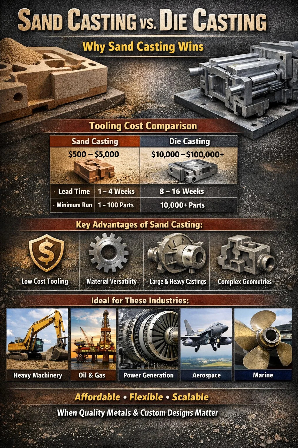 সংক্ষিপ্ত উত্তর: বালি ঢালাই খরচ, নমনীয়তা এবং স্কেলে জয়লাভ করে